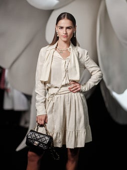 La pré-collection Printemps-Été 2023 revisite l’allure de CHANEL, entre des références au ""tailoring"" et une certaine insouciance ponctuée de clins d’œil aux classiques du vestiaire américain. Un ensemble bicolore s’associe à une chemise à rayures, un jean à motif double C est porté avec un gilet en tweed à carreaux, tandis qu’un tailleur rose évoque la décontraction d’une veste en jean. Des ensembles graphiques à rayures façon base-ball côtoient de la dentelle argentée sophistiquée, une robe en satin fluide et de la maille signée des lettres de CHANEL en version pastel. « Virginie trouve ce bel équilibre entre le féminin et le masculin dans ses créations, confie Vivienne Rohner, qui souligne la dualité inhérente au vocabulaire stylistique de Gabrielle Chanel, aujourd’hui réinterprété par Virginie Viard. Tout en restant fidèle à l’essence de CHANEL, c’est un regard frais et différent. C’est son point de vue et le fait qu’elle soit entourée de gens qui la comprennent et donnent le meilleur d’eux-mêmes rend cela encore plus beau. »